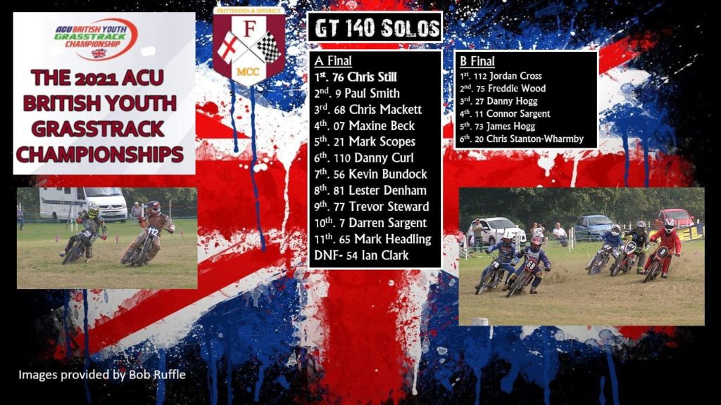 The GT140 class provided entertaining support for the youth racers. Another local rider, Chris Still, took three wins out of three and then duly won the final comfortably. The usual clamber for minor places took place throughout the final.