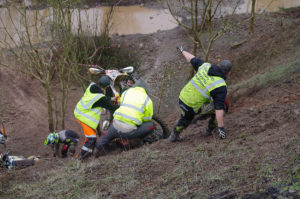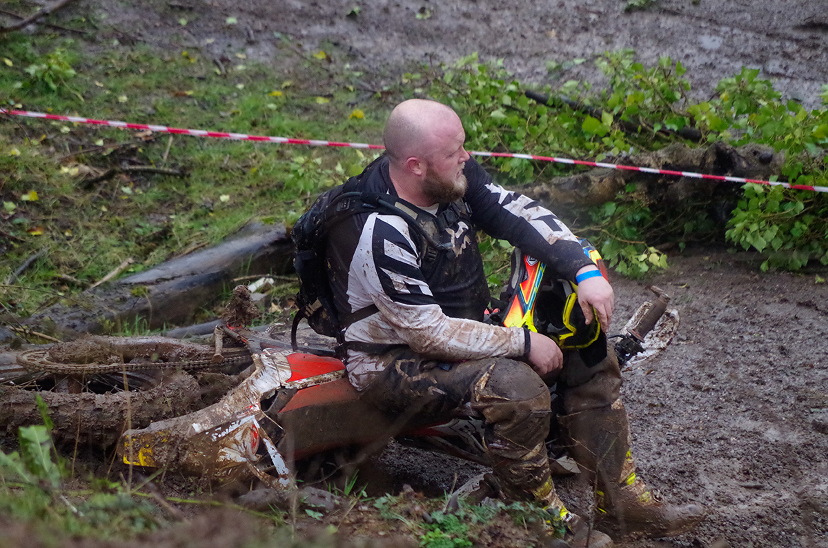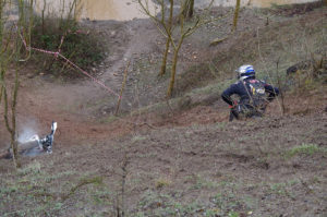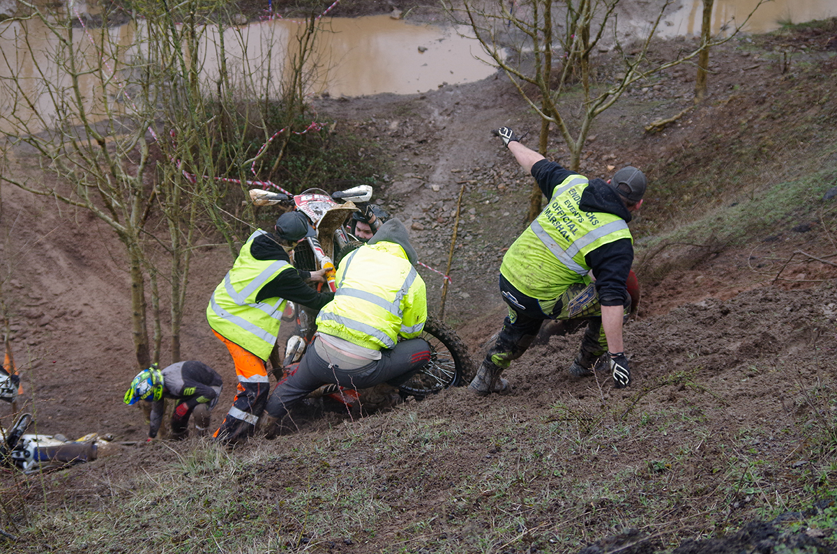 After a short break and some track changes the afternoon race was underway. The track had been made longer with more technical hill climbs. Recognition is truly deserved for all the marshals involved, they worked flat out for the whole 3 hours dragging bikes and bodies up the hills
