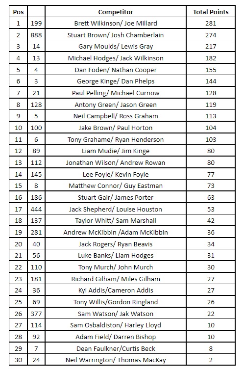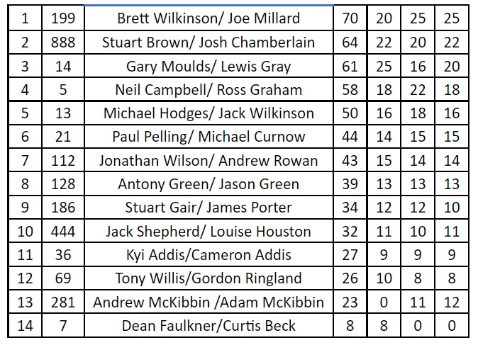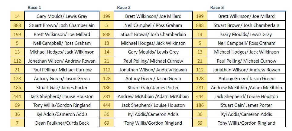At the end of another eventful day, Wilkinson / Millard hold a seven-point advantage from current champions Brown / Chamberlain. Moulds / Gray hold third in the championship, with Hodges/ Wilkinson up to fourth. With Foden / Cooper, and Kinge / Phelps not racing this week they dropped down the leader board but only by one position. Unfortunately, Jake Brown/ Paul Horton missed another event due to injury but still hold a top ten place.