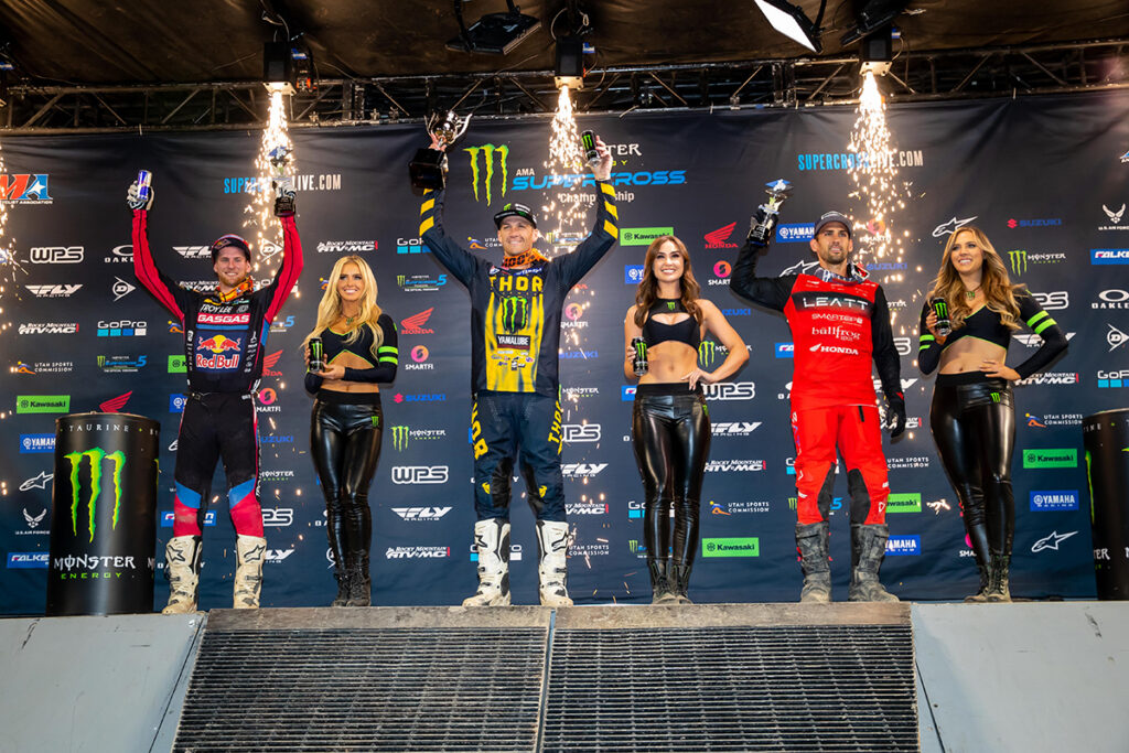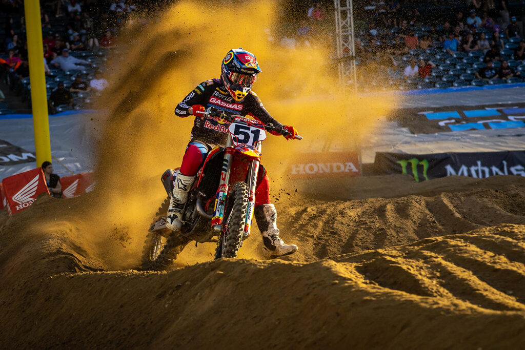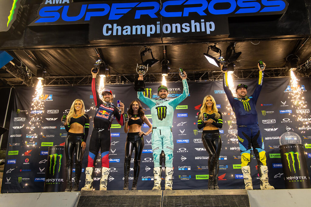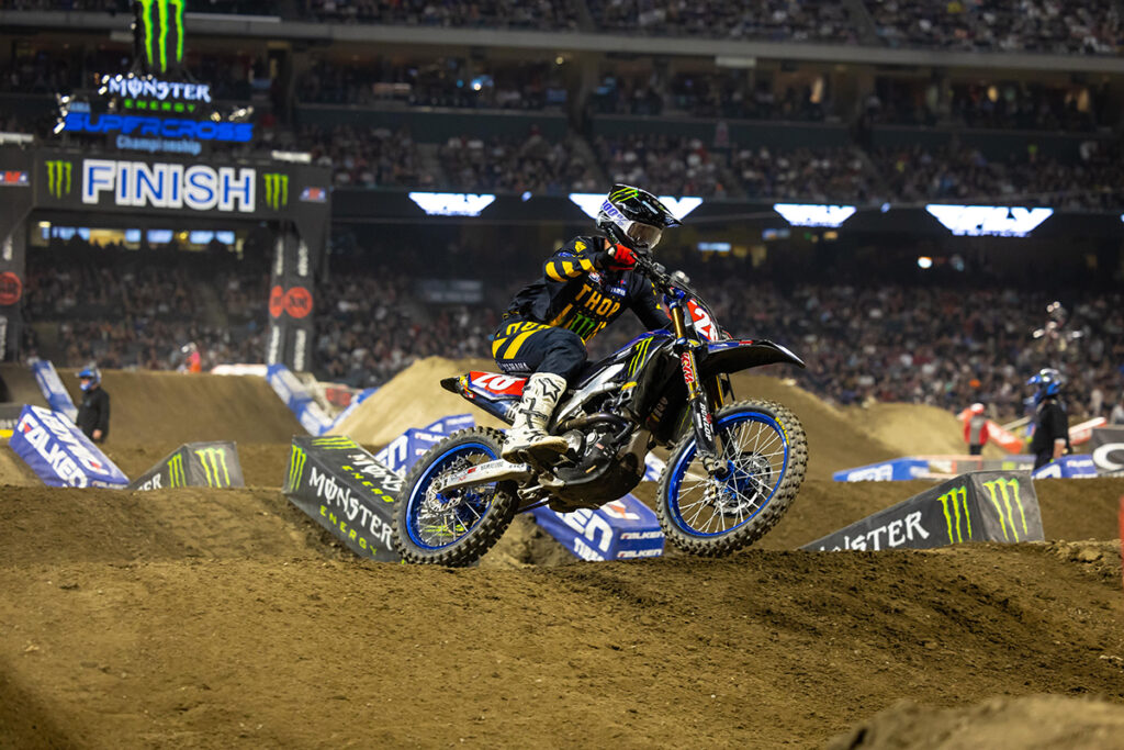 Points leader Monster Energy Star Racing Yamaha’s Eli Tomac stayed on Anderson’s rear fender early but settled for second in the slick conditions of Anaheim 3. Troy Lee Designs Red Bull GASGAS Factory Racing’s Justin Barcia posted his third podium of the year with a steady push forward through the race. The Western Regional 250SX Class saw a clean sweep of the Angel Stadium events by Monster Energy Star Racing Yamaha’s Christian Craig who dramatically stretched out his points lead with the win.