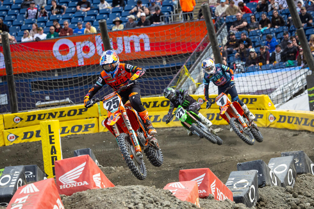Red Bull KTM’s Cooper Webb grabbed the 450SX Class Main Event holeshot with Monster Energy Yamaha Star Racing’s Eli Tomac right on his rear tire and Jason Anderson close behind Tomac. Tomac needed only to finish ahead of Anderson to wrap up his second championship. But less than two minutes into the 20-minute plus one lap race, Anderson took advantage of Tomac’s battle with Webb to slice under in a corner. The block pass was not overly aggressive, but in trying to avoid contact, Tomac stalled his bike.