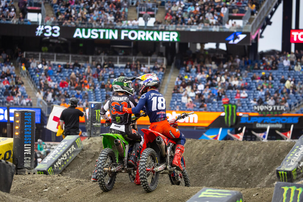Team Honda HRC’s Chase Sexton challenged for the lead late in the race but had to settle for second place when the checkered flag flew inside Gillette Stadium. Red Bull KTM’s Marvin Musquin was back on the podium with a third place finish inside the venue where he won when the series last visited in 2018. In the Eastern Regional 250SX Class’ penultimate round, Monster Energy Pro Circuit Kawasaki’s Austin Forkner fought forward for the win but the bigger news was that Team Honda HRC’s Jett Lawrence finished second in the race to capture his first Monster Energy AMA Supercross 250SX Class Championship.