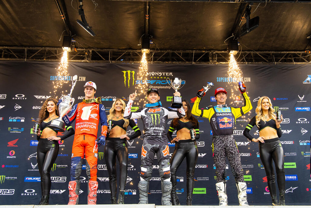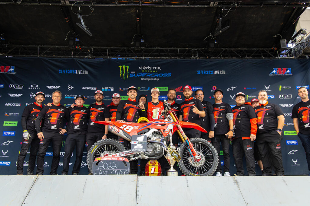 Brown stretched out his early lead as Hampshire moved forward from fifth place; Lawrence battled with Forkner as they sliced forward through the pack further back. With under four minutes left on the race clock, Hampshire clipped Brown’s rear wheel while closing in on the lead and Hampshire went down. Forkner and Lawrence were quickly past; both riders then reached and passed Brown in the closing laps. The win was an emotional one for Forkner, his first since 2020, and the title was more so an emotional accomplishment for 18-year-old Australian Jett Lawrence, who takes the championship in his third year racing Supercross in the United States. Lawrence earned the number one plate through consistency as well as speed. The popular racer finished every 2022 race on the podium, including four wins.