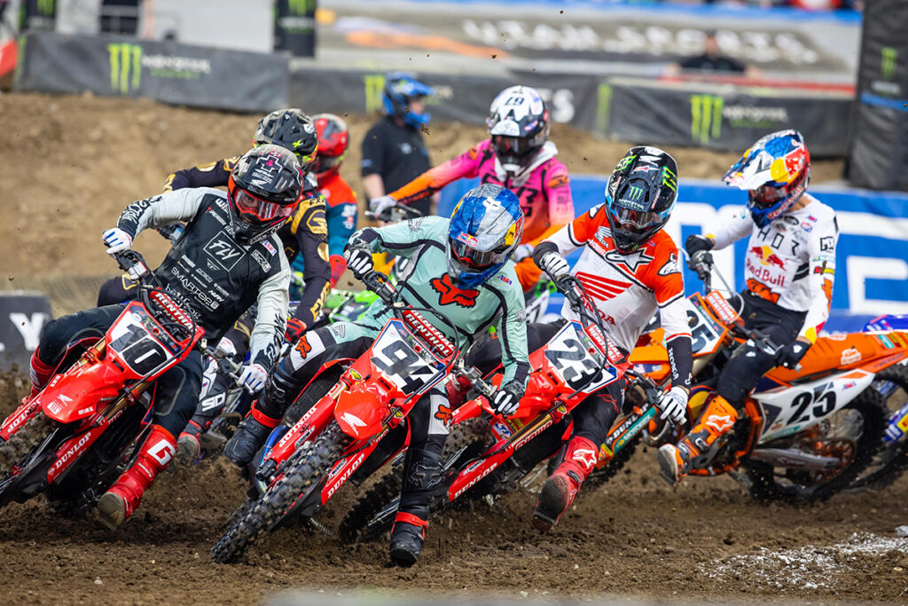 There were opening round jitters and anticipation as the Eastern Regional 250SX Class kicked off in Minneapolis. Monster Energy Pro Circuit Kawasaki’s Austin Forkner jumped into the lead at the Holeshot stripe with Jett Lawrence quickly into the second spot ahead of Forkner’s teammate Cameron McAdoo. Lawrence put an aggressive inside-line pass on Forkner less than a minute after the gate drop then rode a smooth and effortless-looking race to the first checkered flag of Eastern Regional 250SX Class competition. Forkner held second place to the end, and McAdoo grabbed third after fending off a mid-race challenge by Monster Energy Star Racing Yamaha’s Jeremy Martin. Rockstar Energy Husqvarna Factory Racing’s RJ Hampshire rounded out the top five after closing on Martin but running out of time for a pass attempt.