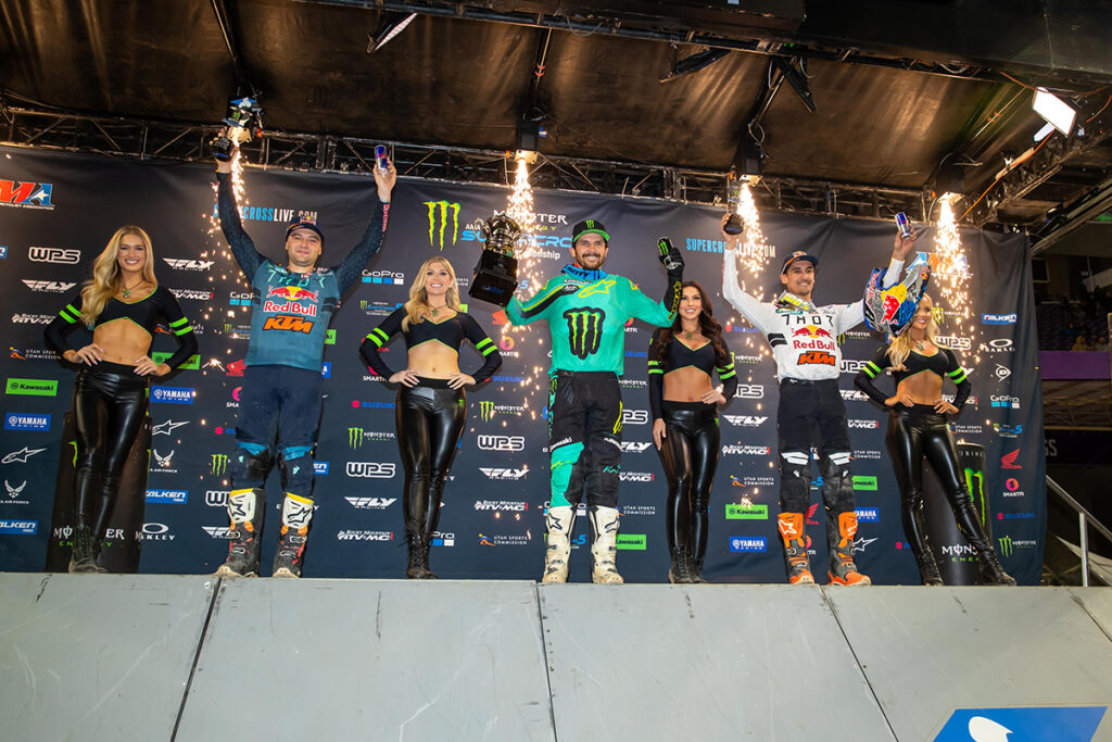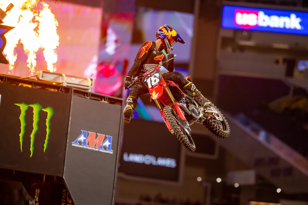 Just when the finishing order looked settled, Sexton’s front wheel tucked and torqued the bike to a quick stop on a jump face. The bike flung Sexton into the air. The crash warped the bike’s front wheel and the impact took Sexton out of the race in spite of trying to remount the machine. The Monster Energy Supercross flames signaled Anderson’s third win of the season. Webb took second place and Musquin tallied his first 2022 podium. Tomac’s speed allowed him to recover to a sixth-place finish to hold onto the championship points lead.