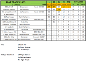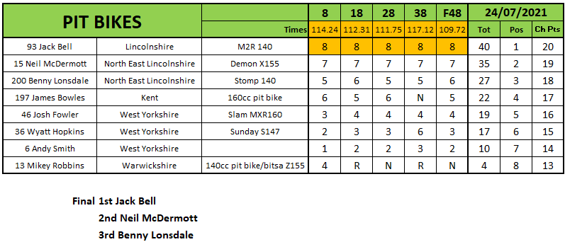 Jack Bell did another Flat Track and Pit Bike double but he didn’t keep a clean sheet in the Flat Track races with Luke Gardner notching up a race win. Bell would win the Flat Track final ahead of Gardner and James Woodruffe. Behind Bell on the Pit Bikes was Neil Mcdermott and Benny Lonsdale.