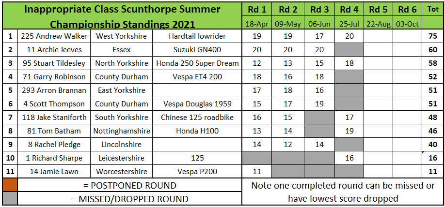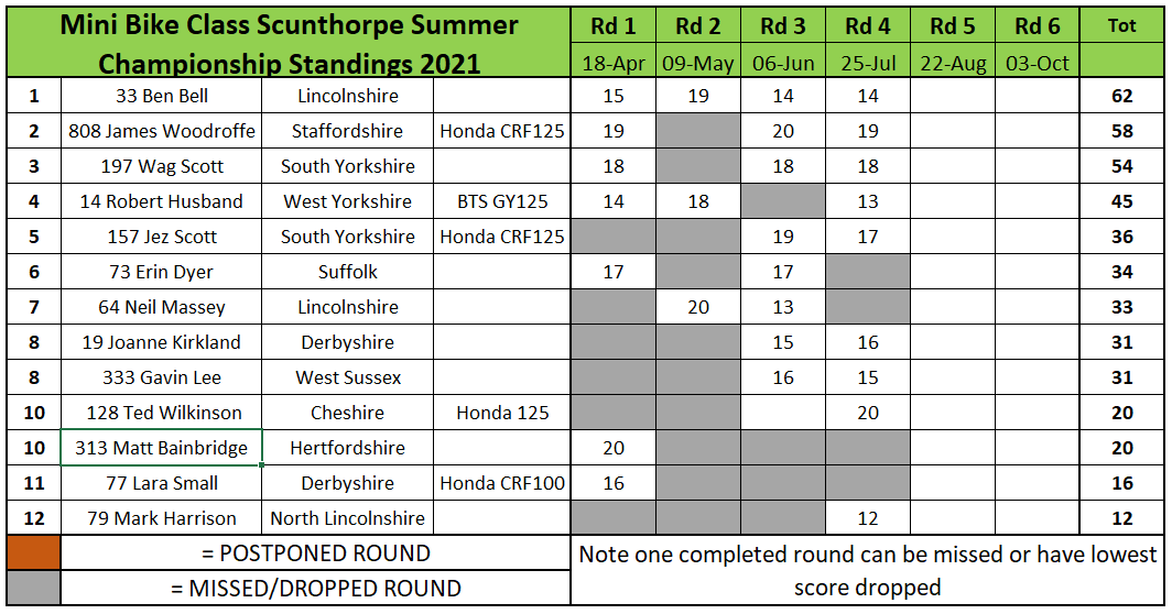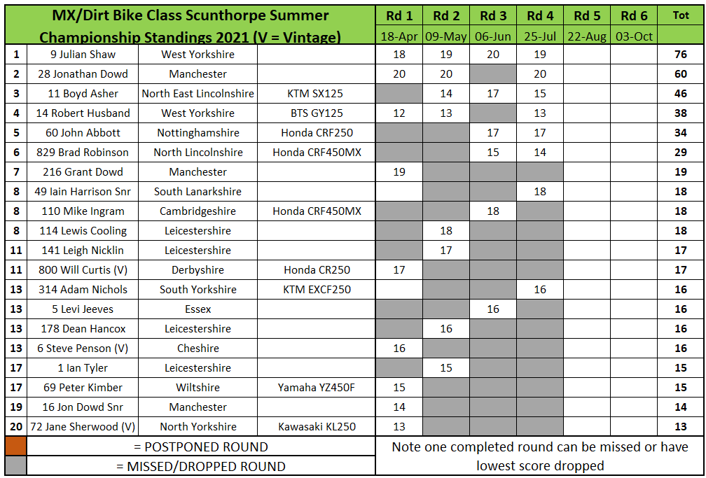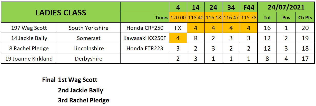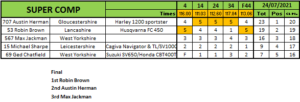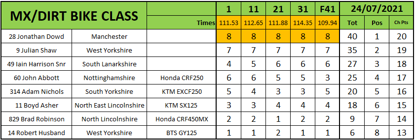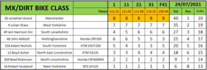 In the MX/Dirt Bike class Jonathan Dowd clawed back some championship points by beating series leader Julian Shaw in every race and the final. Dowd was second in the final with Iain Harrison Snr third.