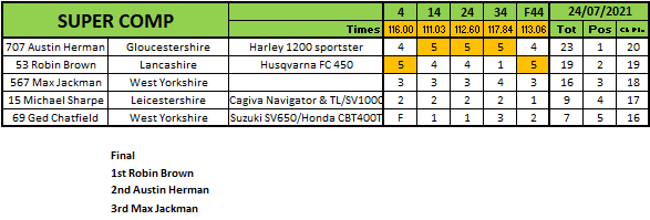 Robin Brown and Austin Harman went at it for the Super Comp honours and although Harman notched up the most points the bragging rights in the final went the way of Harman. Brown would finish second in the final with Max Jackman third.