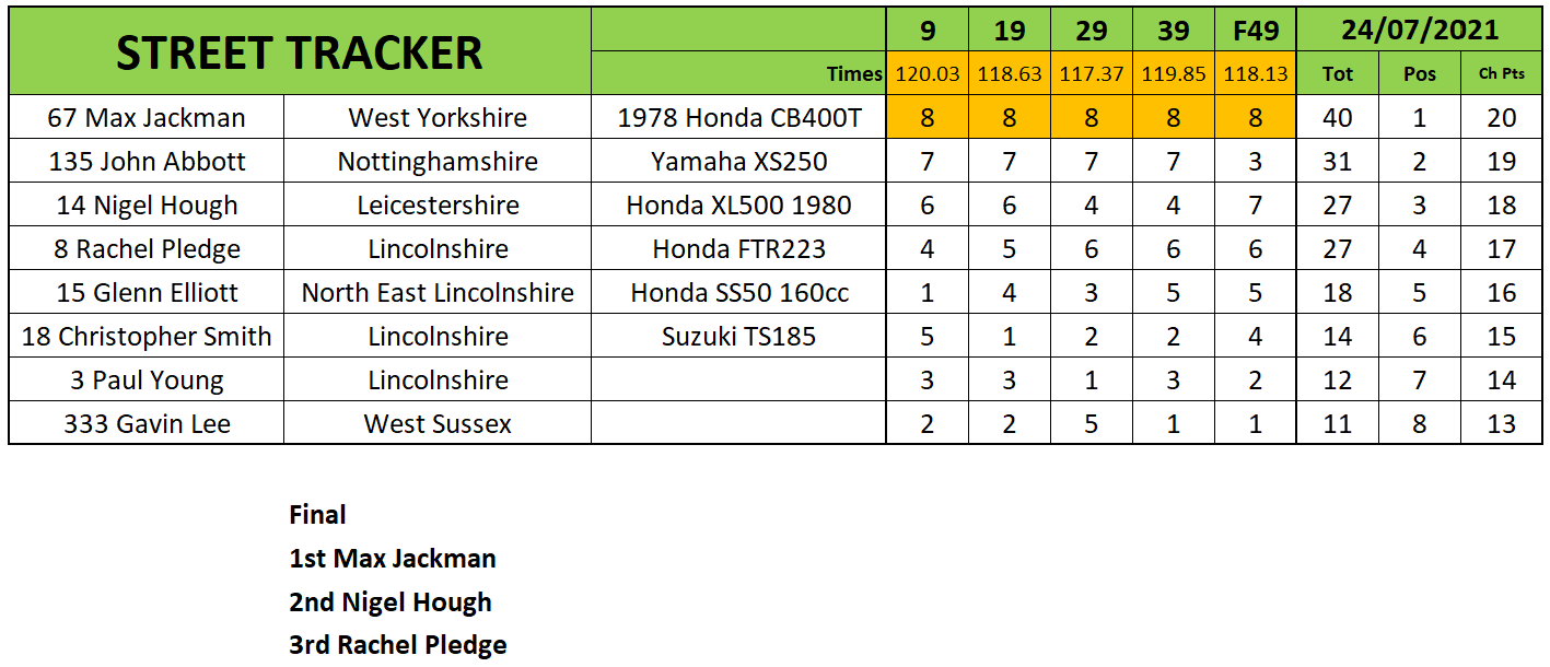 On the subject of Jackman he put on a masterclass in the Street Tracker category piling in with victories in each heat and the final ahead of Nigel Hough and Rachel Pledge.