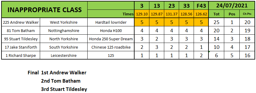 Andrew Walker was in stunning form in the Inappropriate class and rattled off 5 heat wins before taking victory in the final over Tom Batham and Stuart Tildesley.