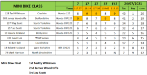 Over in the Minibikes Ted Wilkinson and James Woodruffe traded places in the heats but it was Wilkinson that came good in the final fending off Woodruffe who was second and Wag Scott third.
