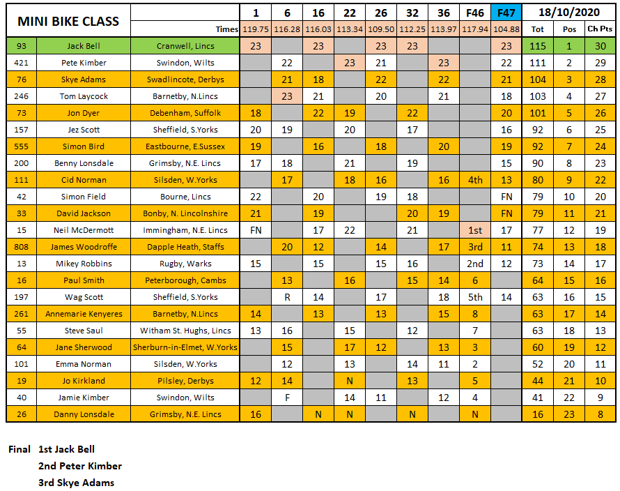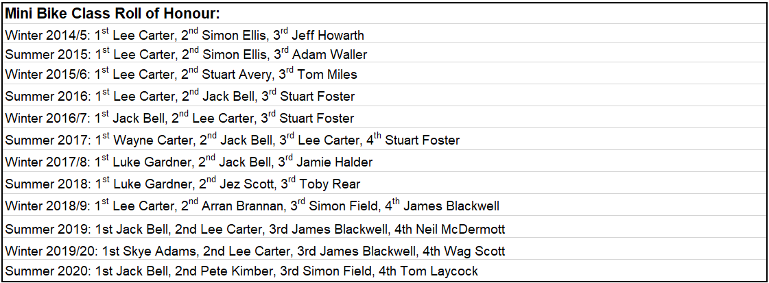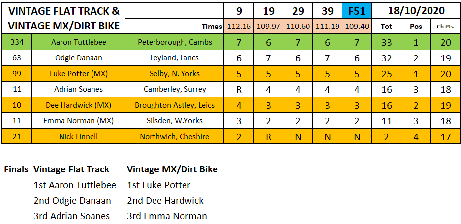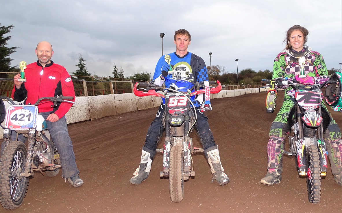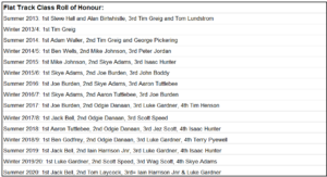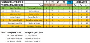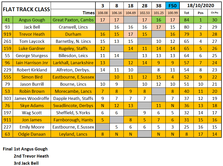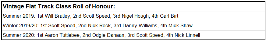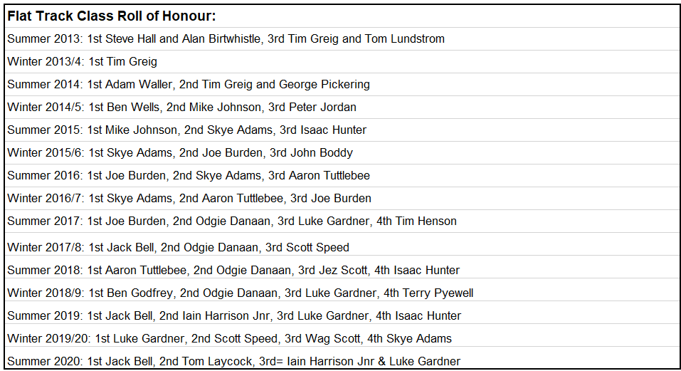 Angus Gough made an impressive debut in the 2020 championship by winning three out of the four Flat Track class heat and the final over a Trevor Heath and the newly crowned champion Jack Bell who has had a stunning season.