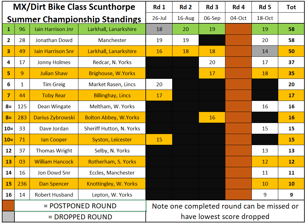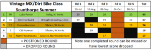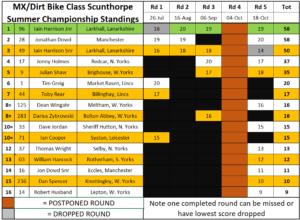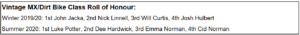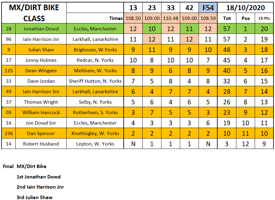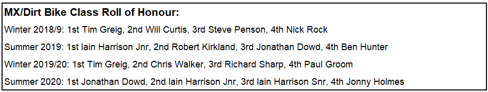 Jonathan Dowd would make a late run for the MX & Dirtbike title after trading heat wins with Iain Harrison Junior and pulling off the win in the final, which meant he took the championship by a whisker. Julian Shaw had a great day and stood on the third step of the podium.