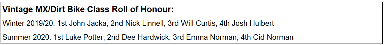 It was another masterful day of racing from Luke Potter who added the Vintage MX title to his Street Tracker Championship. Behind Potter in the final was Dee Hardwick and Emma Norman.