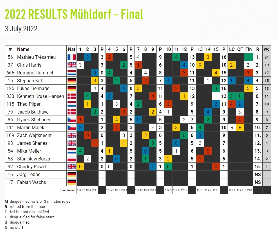 Both defending champion Hummel and Fienhage, winner in 2020, improved on their dismal results from Final 1. The Dutchman happily avoided the machinery problems that had troubled him in Poland, but he set the fastest race time and his third place here should signal his return to form. Fienhage was top of the qualifiers and although finishing last in the final his 13 points take him up to eighth in the standings.