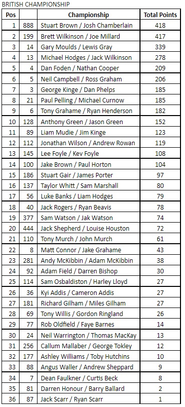At the end of another eventful day current champions Brown / Chamberlain retained their championship title for another year, for Stuart in the year he turned 50 this is an amazing achievement, for Brett Wilkinson / Joe Millard they were so close to a title in their first season together which is also amazing.