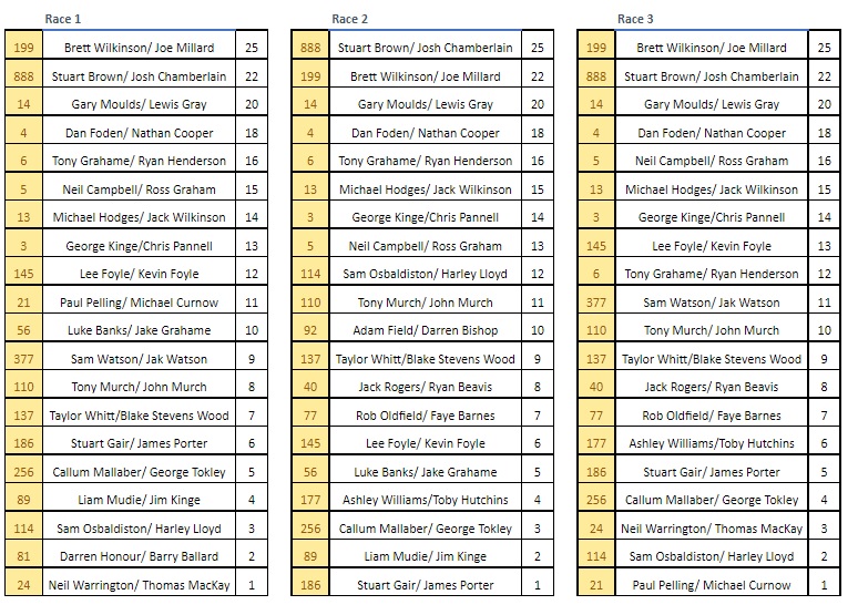 In the last championship race of the season Stuart Brown / Josh Chamberlain held a four-point championship advantage at the start of the race and were determined to keep it that way, but it was Brett Wilkinson / Joe Millard who took the hole shot from Gary Moulds / Lewis Gray with Dan Foden / Nathan Cooper third and Stuart Brown / Josh Chamberlain fourth. A big cheer went up from the Wilkinson Fans, and the Brown fans held their breath because they knew that if Brett Wilkinson / Joe Millard won this race Stuart Brown / Josh Chamberlain had to be second to retain the championship title. The battle was on. Brett Wilkinson / Joe Millard held the lead throughout doing everything they could to gain maximum points, the rest was outside their control. Behind Stuart Brown / Josh Chamberlain gradually moved forward, steady and leaving nothing to chance, they slotted into second place, and that was enough to take the championship win by just one point. What fantastic racing from both teams, in every race all season, nothing less than a third place in any race from either team. The large crowd appreciate that and gave both teams massive cheers as they crossed the line, as they did for Gary Moulds / Lewis Gray who took third in the championship. Dan Foden/ Nathan Cooper held fourth. A brilliant race behind for fifth place with Neil Campbell/ Ross Graham moving ahead of Michael Hodges/ Jack Wilkinson.