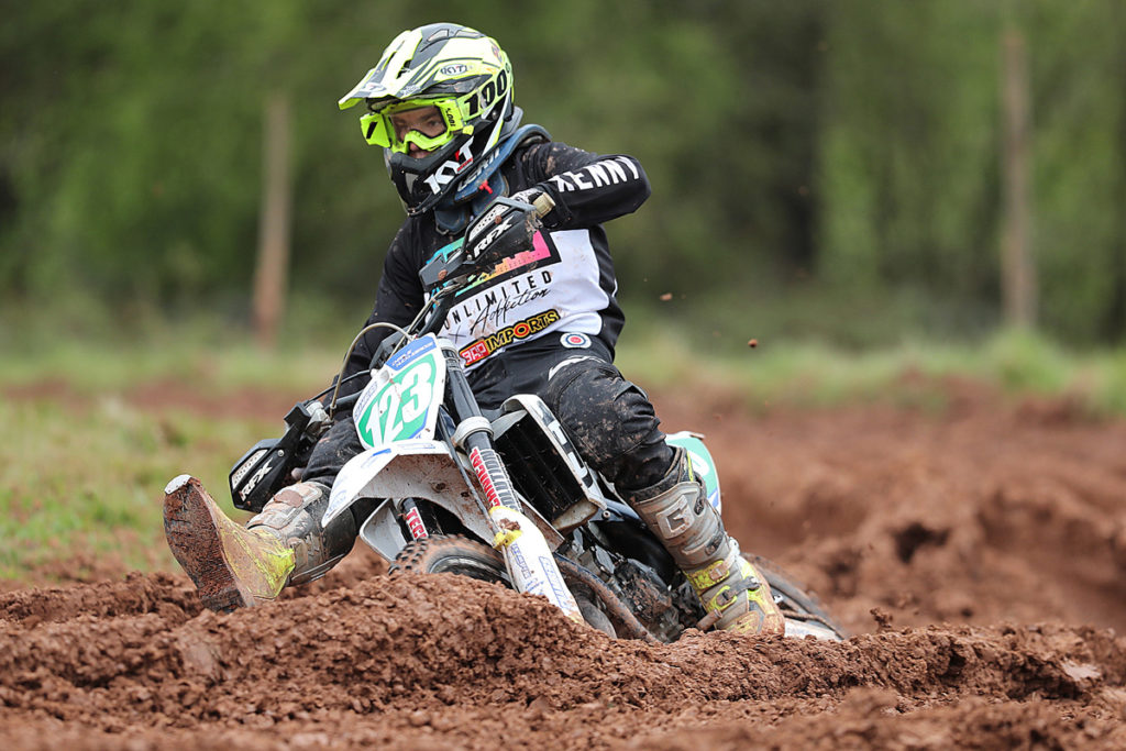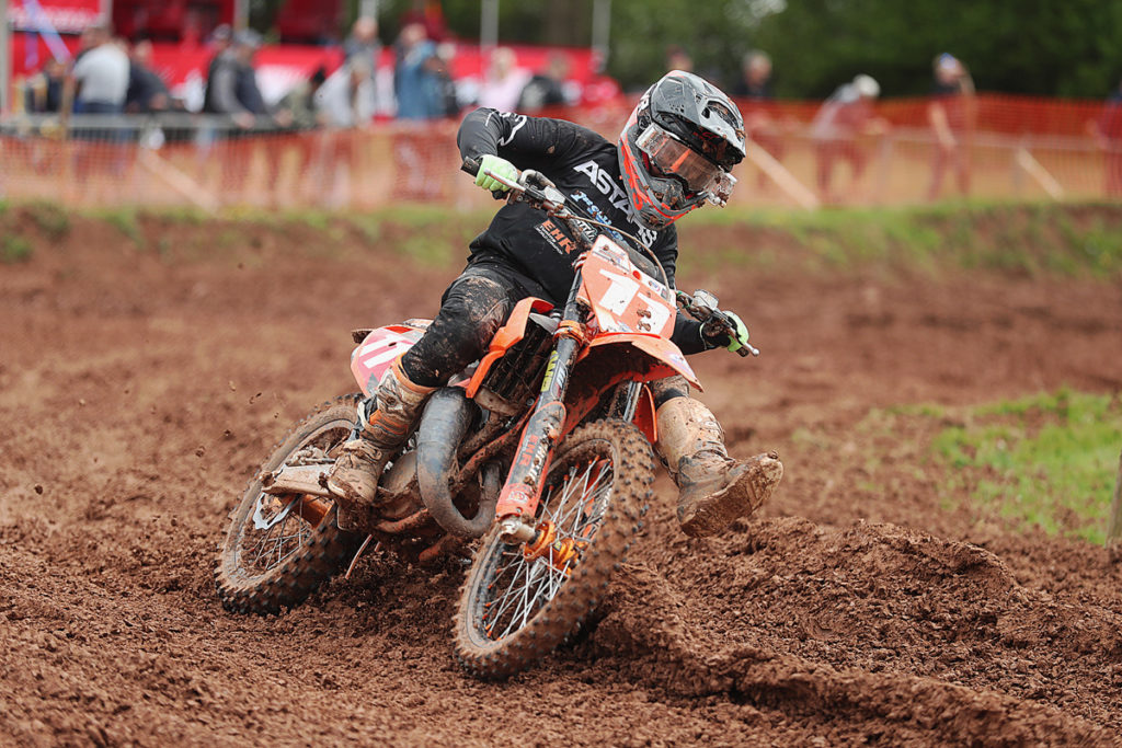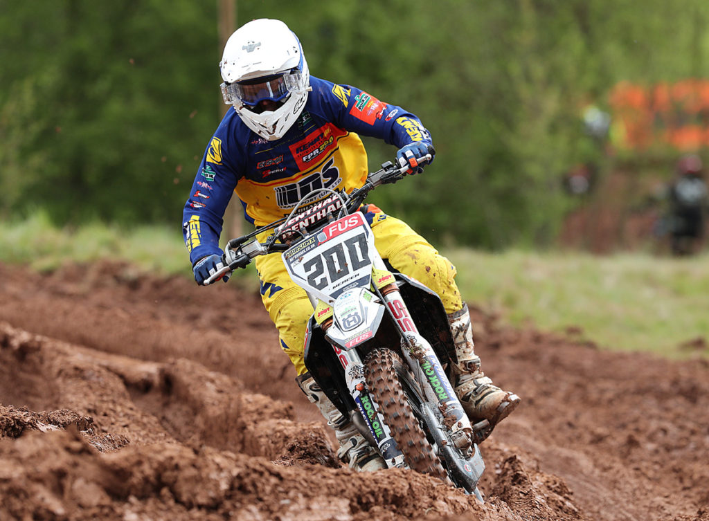 With Beard falling on the opening turn of moto two and with it all now to do, Williams and Bradshaw briefly took turns to lead the way before the super-fast Carless came gliding past! Having stormed to a massive 30 seconds victory in moto one, Carless was right on it again in this one with Williams in 2nd and his FUS Marsh MX Husqvarna teammate Bradshaw proving to be his closest challengers. With rain again falling and making conditions a little tricky, Rowson took 4th from Alfie Jones, Adam Collings,young Peters and Beard, getting back up to a super 8th following his earlier tumble.