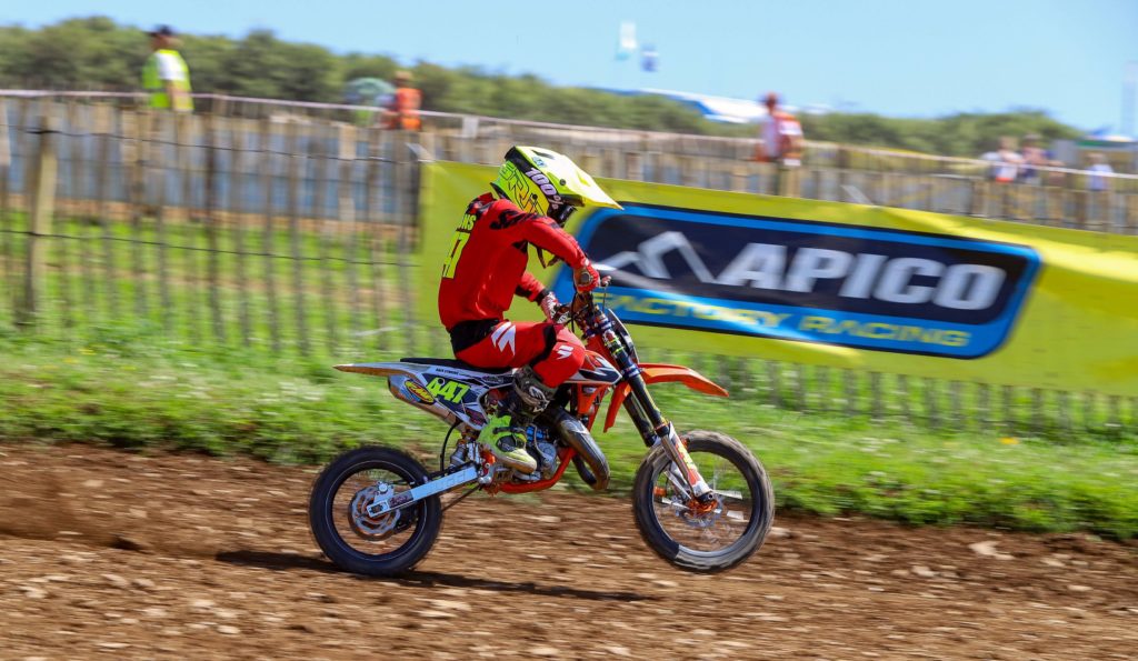 Small wheel 85’s saw fastest qualifier Danny Flaude go down on numerous occasions leaving him with an uphill struggle to get back on terms with the top 3 only managing fourth in race one and a disastrous second moto crossing the line tenth. Meanwhile, Lucus Moncrieff made hay while the sun shone. Followed home by over half a minute in moto one by eventual overall runner up Ruben Always and Reegan Rogers on his rear fender. Moncrieff went on to take the second and third heats again with a comfortable margin with both Rogers and Always squabbling for podium places. Flaude had a better third outing pushing Always down to fourth and then came out swinging for the first encounter on Sunday taking the win in a close-fought battle with Always and Moncrieff. Moncrieff got the better of Flaude in the final event securing himself a well deserved overall. Super consistent Harry Woodland got a fifth overall for his efforts one place behind Flaude.