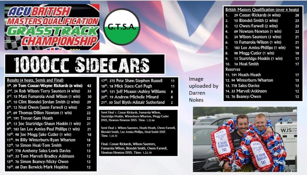 G.T.S.A hosted a stacked British Masters Grasstrack Qualifier at Dig Dog Lane, Frittenden on Sunday with Tom Cossar and Wayne Rickards putting in an impeccable performance in the 1000cc Sidecars going unbeaten.
