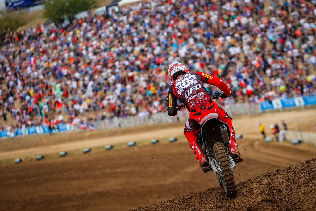 In the opening race of the weekend, the holeshot went to Fantic Factory Team Maddii’s Hakon Osterhagen who led his teammate, Cornelius Toendel. Toendel was in a crucial position and needed every point possible to try to keep his championship hope alive, though that all ended quickly after he banged bars with another rider going down one of the downhills and crashed.