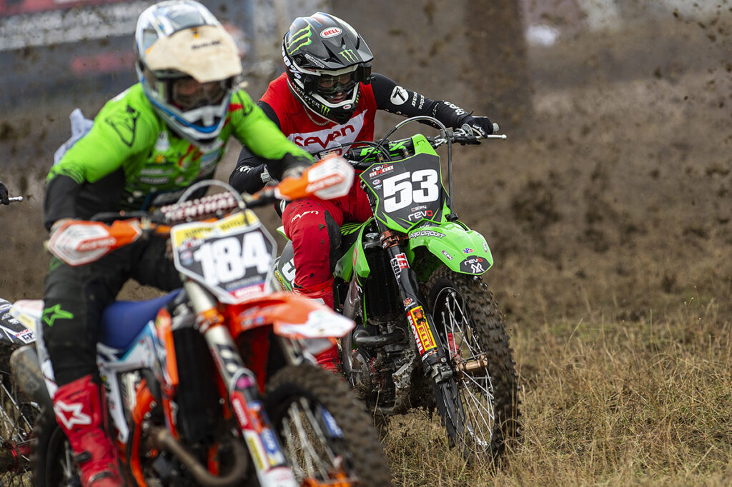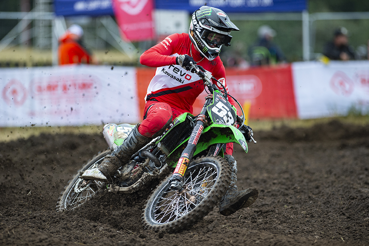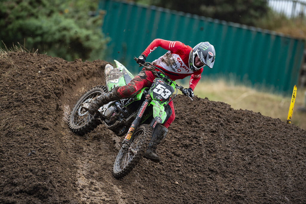 Determined to make his clear speed count for a result, he fought hard through the first corner to secure the holeshot, and on a drier circuit set a blazing pace to record the fastest lap again! Despite falling late on, “like an idiot”, he still took the race win by nearly 20 seconds from title winner Conrad Mewse.