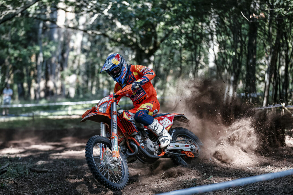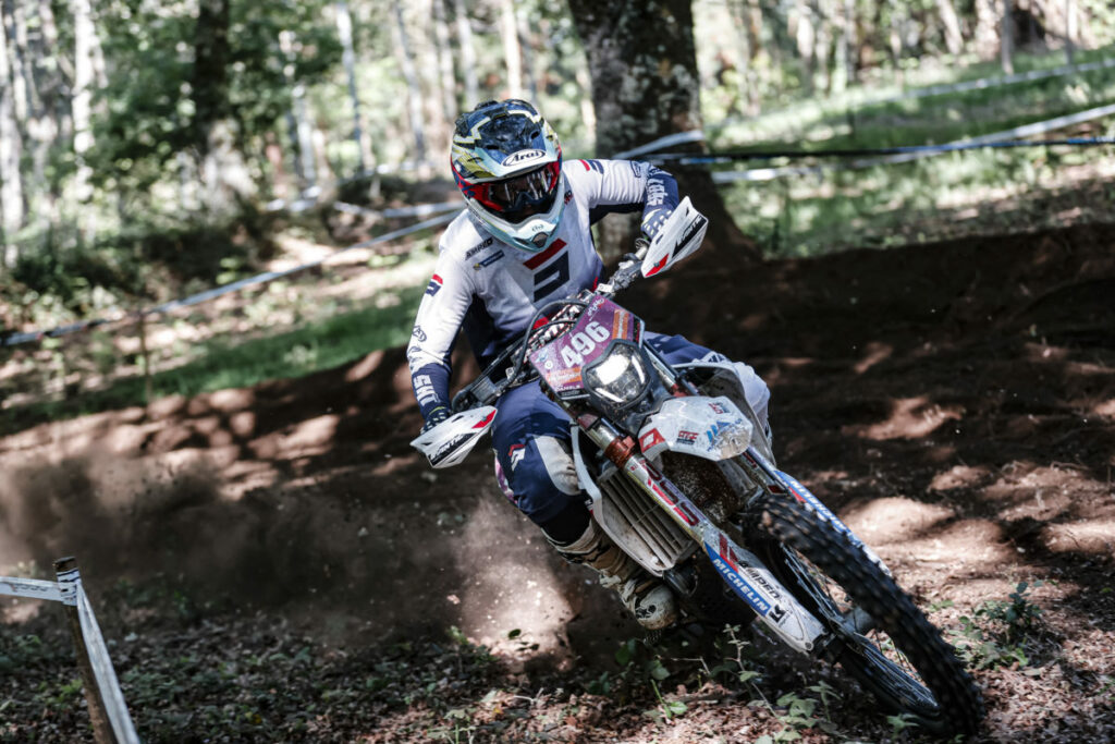 Up to speed on day two, Freeman left few opportunities for his Enduro3 classmates. Convincingly winning all nine tests, he ended his day over one minute and 42 seconds clear of Fantic’s Davide Guarneri in second. Another solid outing for senior class rookie Matteo Pavoni (TM) saw him finish third.