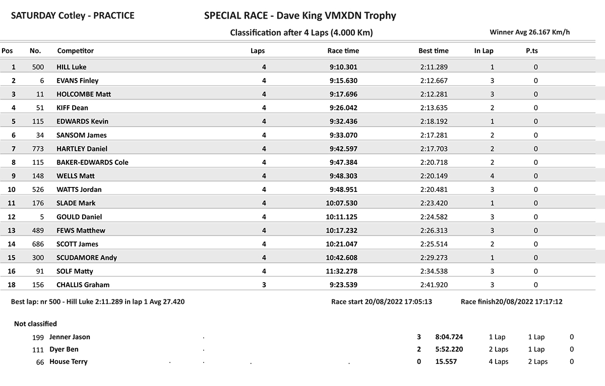 Also on the Saturday the club ran a one off race of four laps which was called the Badgers Bash race which was a thrilling race especially in the early stages as Luke Hill had led from the off but right with him was Terry House who was all over Hill like a rash looking for an opportunity to get past, but unfortunately for House a stone was to jam in his front wheel and his front brake was to stay on and this was to let Hill get away and that was exactly what he did as he raced away to win the Badgers Bash Trophy from Finlay Evans and Matt Holcombe.