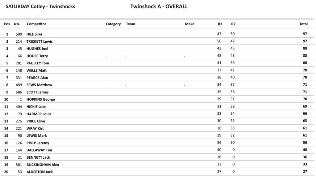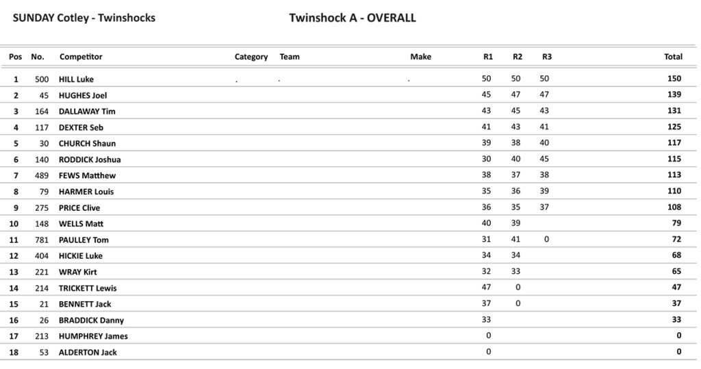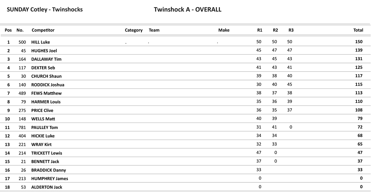 In the Twinshock A class on Saturday there was a battle royal between Lewis Trickett on his 545 PDS Triumph and Luke Hill on the Cr 500 Honda with Terry House back riding after a four week break on his 490 Fasthouse/Butler Racing Maico also giving his all. Trickett and Hill were at it straight from the off with House having to keep in touch on the opening lap, but a mistake from House on the second lap saw him stall his bike which dropped him down the field. Trickett was put under a lot of pressure from Hill mid race, but Trickett held strong and took the win with House coming back from his earlier mistake to take third. In the second moto there was real drama off the line with House nearly flipping his Maico twice, but it was Hill who led from Trickett with Joel Hughes on his 510 Husqvarna with a better start in this one tucked in third with House there in fourth, but House was to come off and had it all to do. Hill was powering away at the front and was to take a comfortable win from Trickett who was pushed all the way to the line by Hughes. Hill and Trickett ended the day tied on points but by virtue of the last race result Hill took the overall from Trickett with Hughes taking third overall.