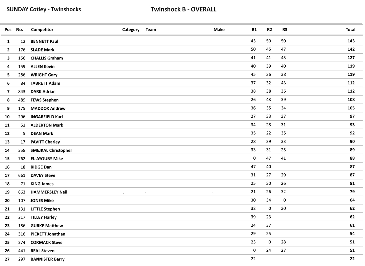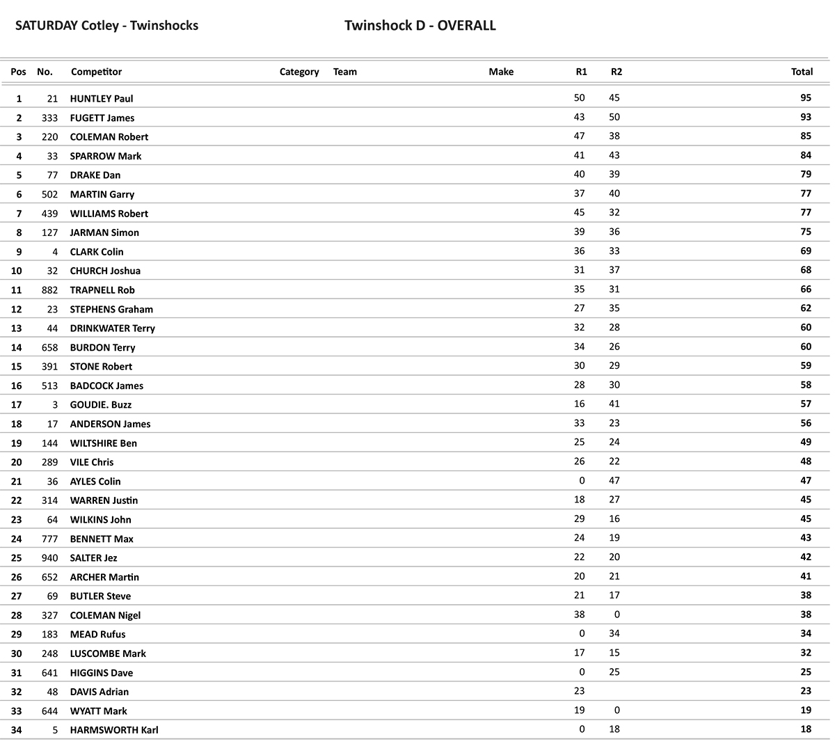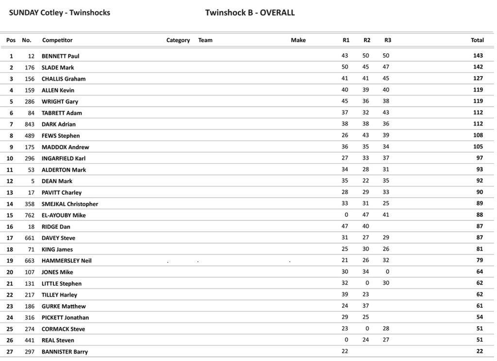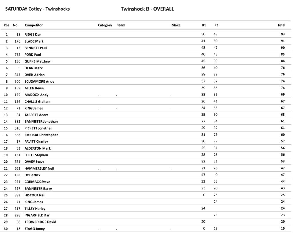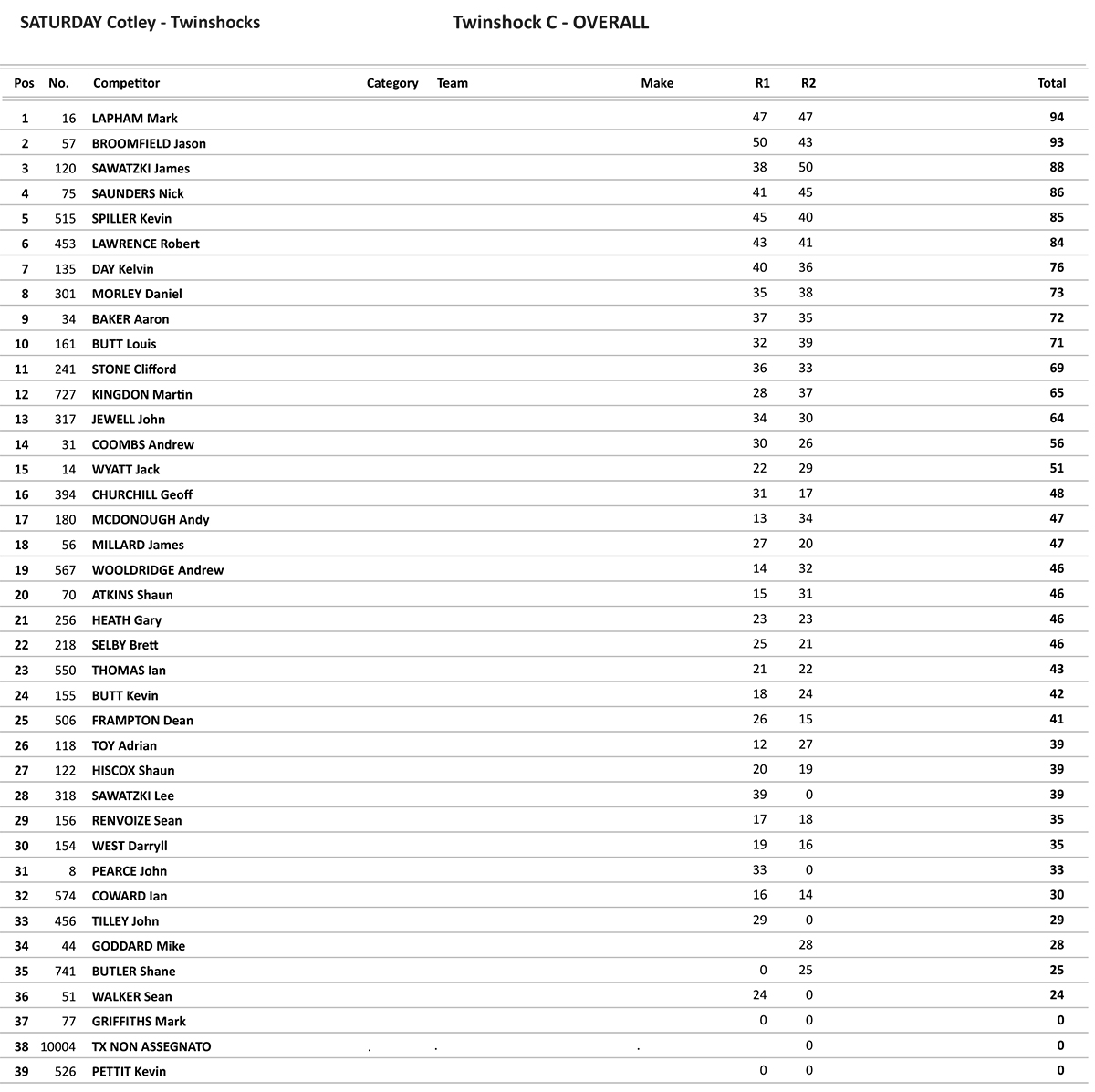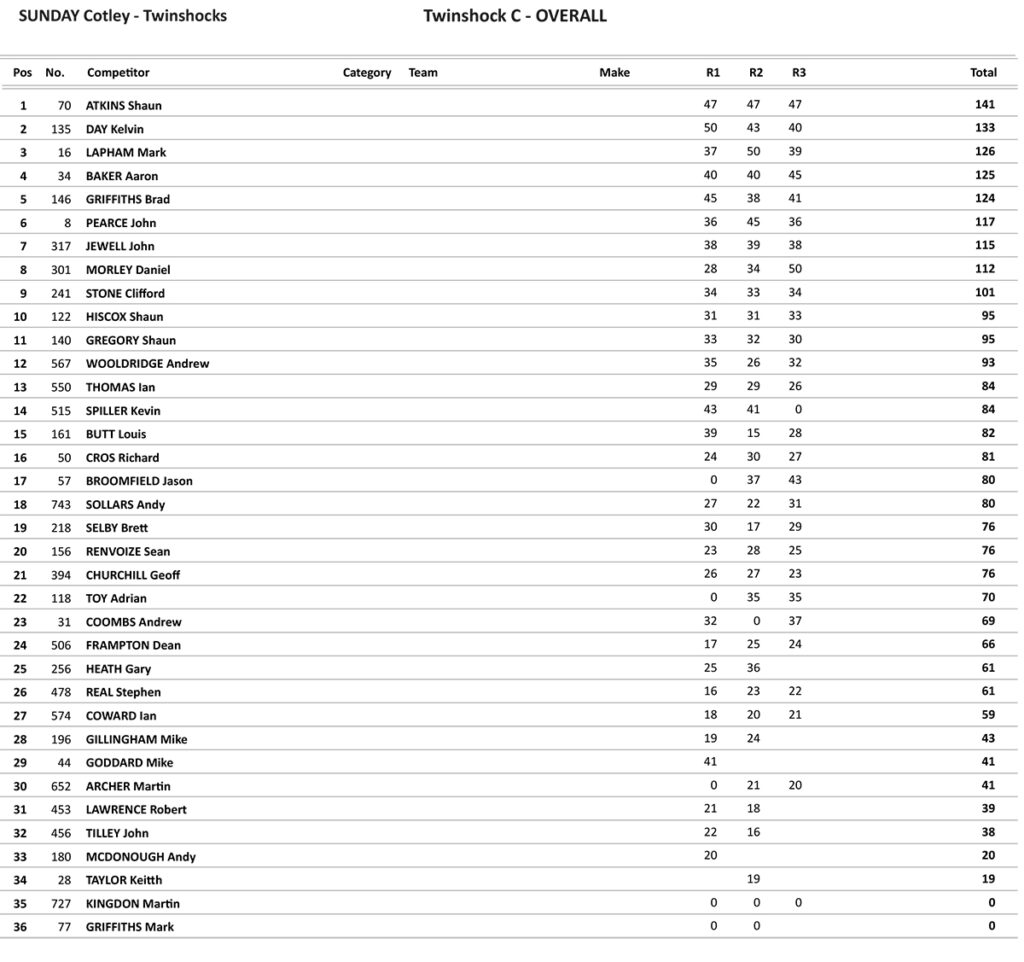 In the Twinshock C class on the Saturday there were wins for both Jason Broomfield and James Sawatzki but with two second place finishes the overall went to Mark Lapham on his Cr 480 Honda by one point from Broomfield with Sawatzki third overall whereas on the Sunday we had three different winners in the shape of Kelvin Day, Lapham, and Daniel Morley but the overall was to go to Shaun Atkins with a 2-2-2 scorecard with Day second overall and Lapham third.