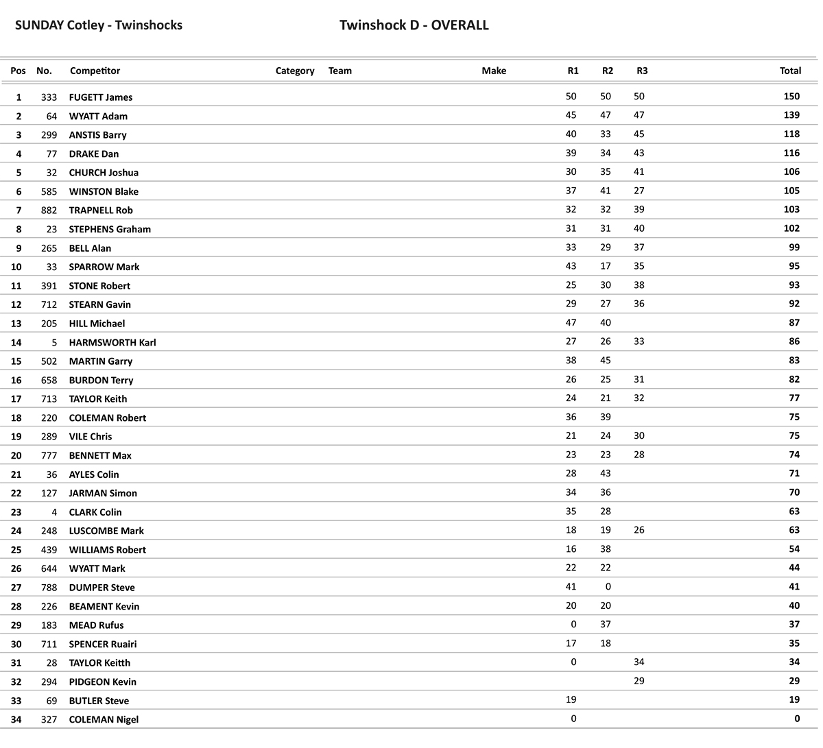 In the Twinshock D class on Saturday Paul Huntley had a win and a third to take the overall from James Fugett who had a 4th and a win and taking third overall was Robert Coleman whereas on the Sunday there was no stopping Fugett who took a hattrick of wins to give him the overall Adam Wyatt was second overall and third overall went to Barry Anstis.
