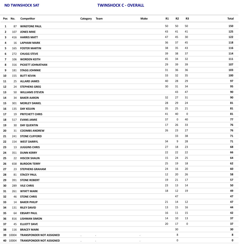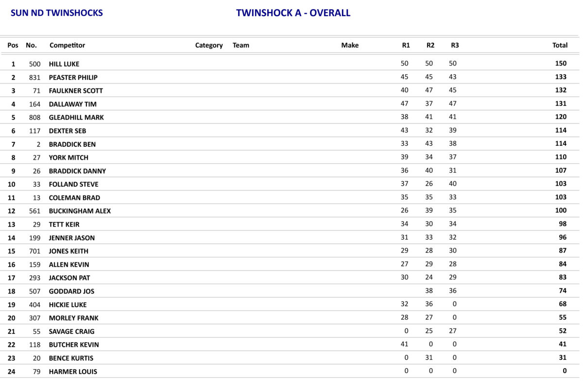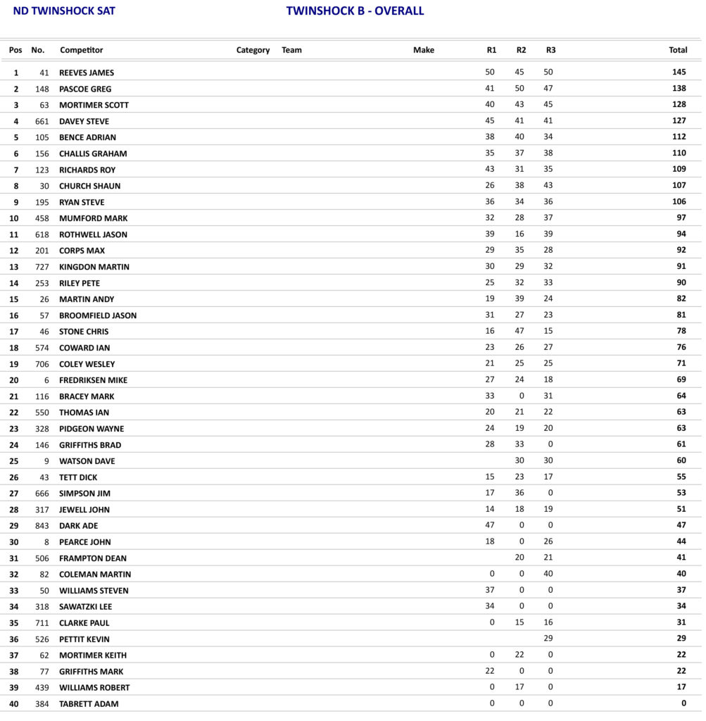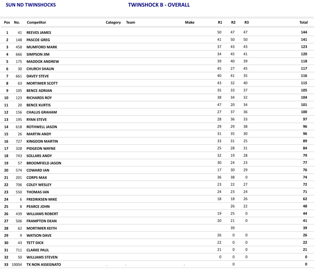 Just as the day before the Twinshock B class produced some good racing with James Reeves again taking the overall, but Reeves only won the opening race as he was beaten in the other two races by Greg Pascoe, but with Pascoe only finishing in fifth place in the opening race he had to settle for second overall.