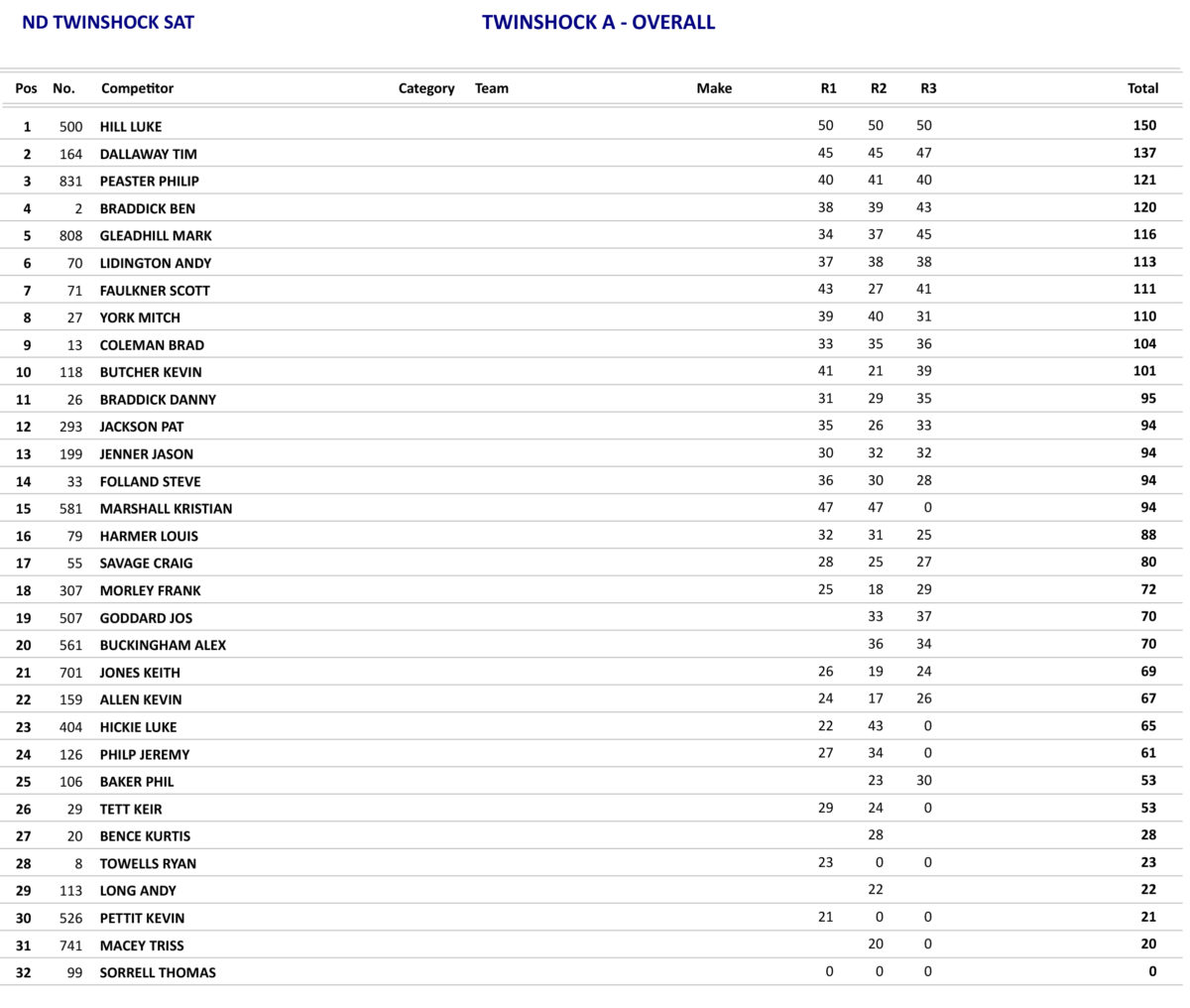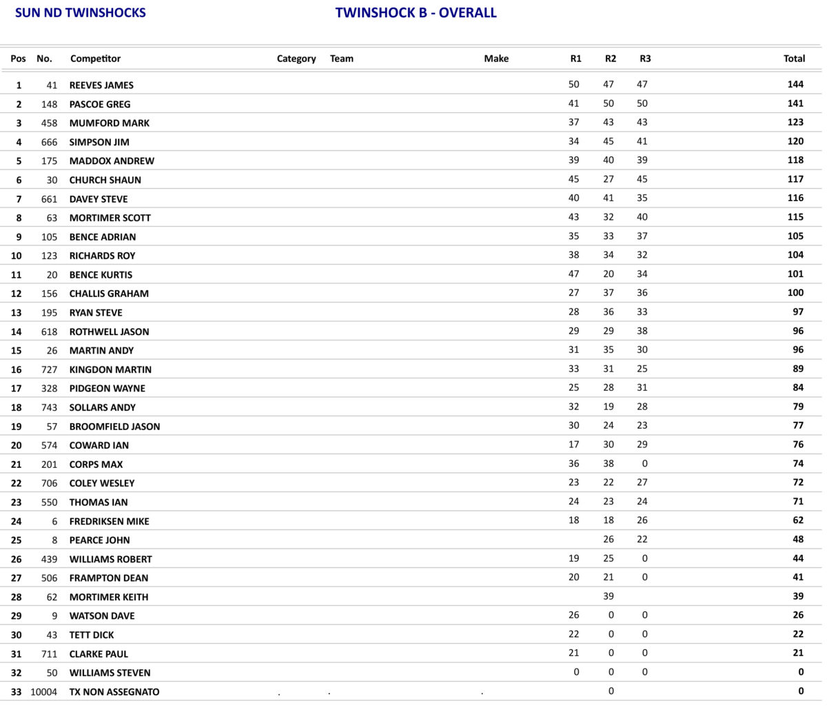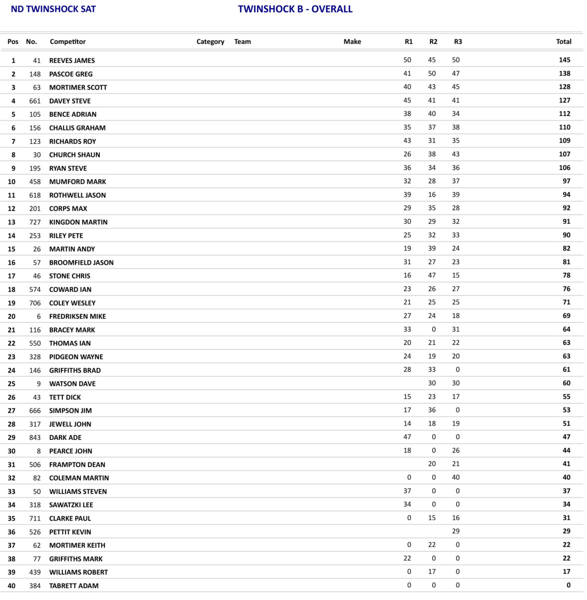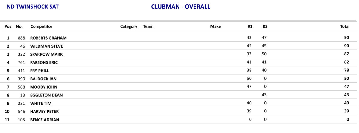 Just as the day before the Twinshock B class produced some good racing with James Reeves again taking the overall, but Reeves only won the opening race as he was beaten in the other two races by Greg Pascoe, but with Pascoe only finishing in fifth place in the opening race he had to settle for second overall.