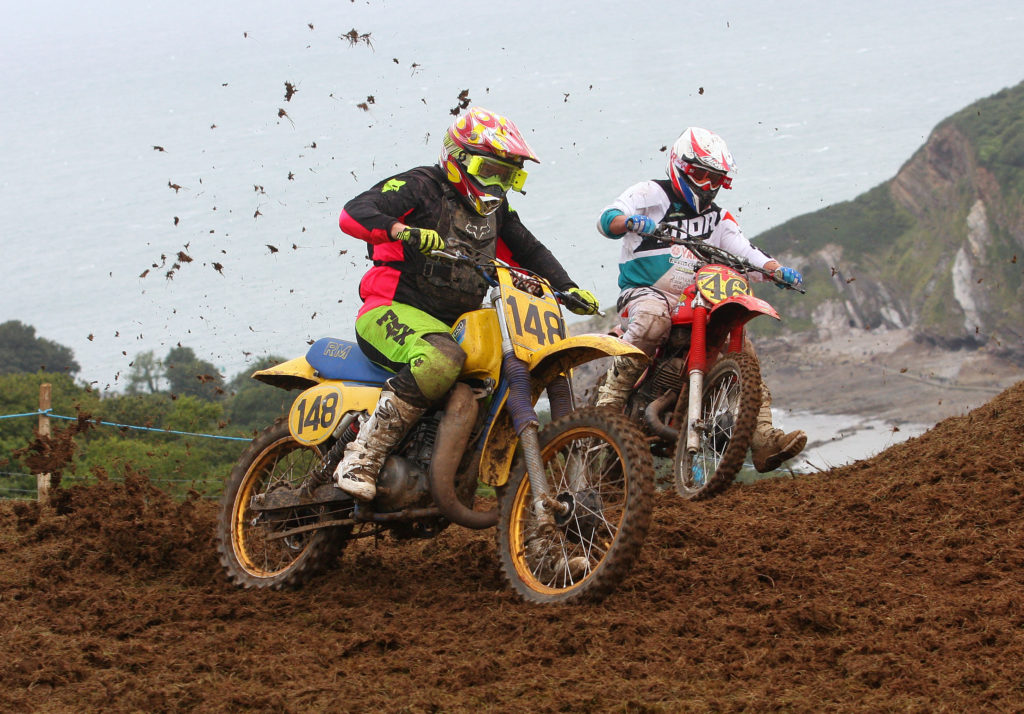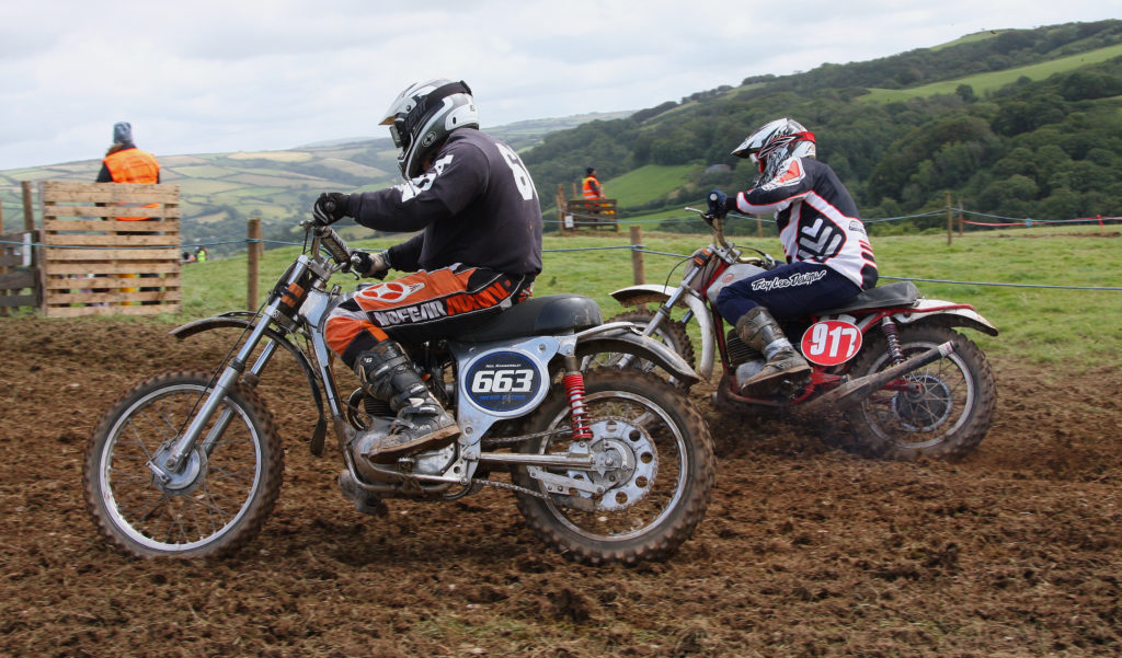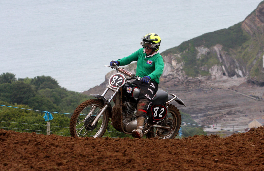 In the Twinshock A class, there were some of the South West’s top riders including one of Devon’s best in the shape of Luke Hill who had plenty of local support. The opening race started with great drama as Hill on his CR500 Honda led into the opening corner followed by the 600 Hickie BSA of Luke Hickie with Dorset’s Terry House on his Fasthouse 490 Maico on the outside but exiting the corner both Hickie and House slid out on the grass and tangled which left them ending up in the hedge. Hill had a clear track in front of him and was to ease away to take a comfortable win from the 440 Maico of Kristian Marshall. In the second moto House was a nonstarter suffering a bit from his first race incident. Just as in the opening race, things were again tight going into the first corner, but Hill kept out of trouble around the outside and was to emerge at the front and was soon in a rhythm, but a battle was to emerge behind Hill between Hickie and Marshall with Marshall eventually bringing it home in second. In the last race this time it was Marshall who was missing on the line after picking up a knee injury in a Pre 74 race earlier and the question was could anyone deny Hill a clean sweep of wins and the answer was no as Hill again emerged out of the first corner at the front and soon eased away, but soon up into second had come Tim Dallaway on his BSA 500 who was to lap roughly at the same pace as Hill for most of the race, but Hill held strong to make it three wins from three and clear overall winner.