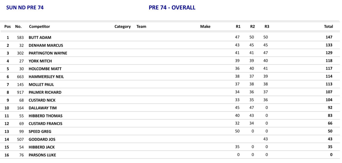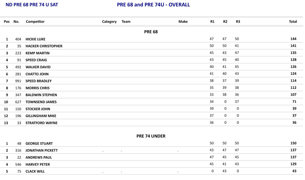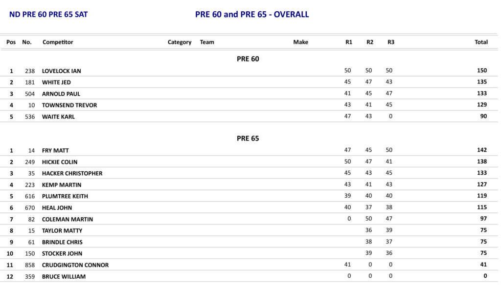 The Pre 65 class saw a real battle for the overall as they went into the last race as Martin Coleman had taken a win and a fourth whereas Matt Fry had also taken a win and a third so Fry had a two points advantage over Coleman, so all Coleman had to do was to win the last race which he did from Fry which gave Coleman the overall by one point.