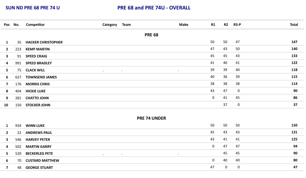 Christopher Hacker as he did on the Saturday was victorious in the opening two Pre 68 races but was denied a clean sweep in the last race by Martin Kemp but with Hacker finishing in second this was to give him the overall.
