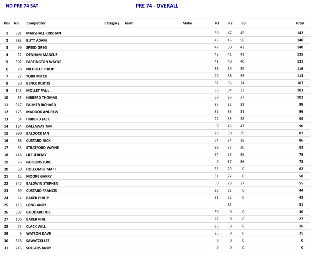The Over 250 Pre 74 class got underway without overall winner on the Saturday Kristian Marshall who had pulled out after his knee had swollen up overnight and it was Greg Speed who took the opening race after a race-long battle with Adam Butt who was a close second with Tim Dallaway eventually coming through to take a distant third. In the second race, Speed was to pull out after two laps with a bike problem and it was Butt who took the win from Dallaway. In the last encounter, it was a better start in this one for Wayne Partington on the 380 CZ who was to give chase after Butt who had led from the start, but Butt was lapping nigh on two seconds quicker than the rest of the field and took the win and the overall.