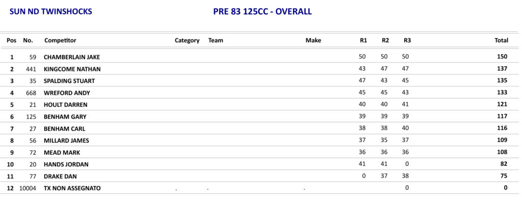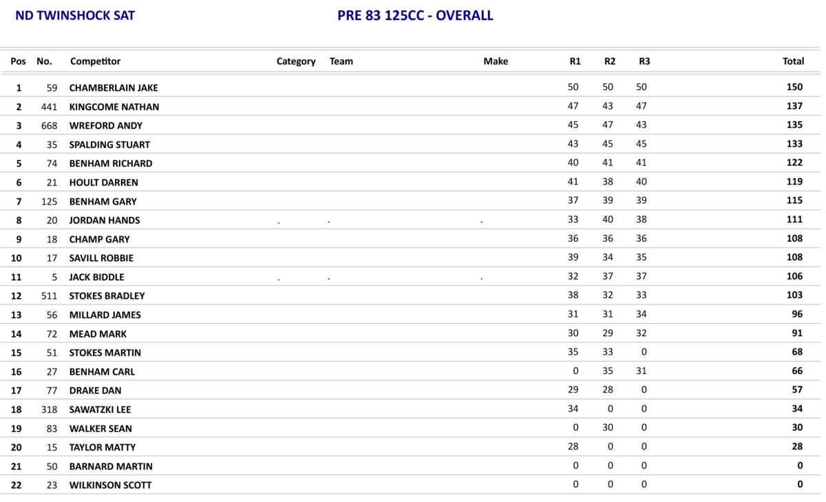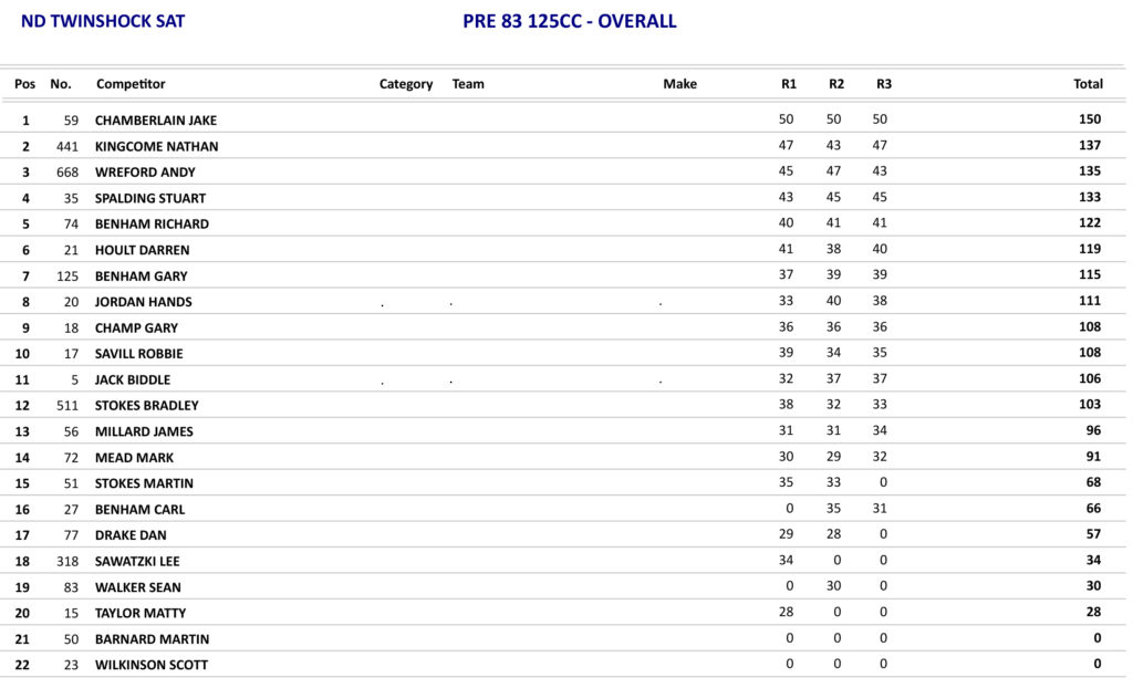 Round 5 of the Pre 83 125 British Championship saw Jake Chamberlain take no prisoners again as he increased his Championship lead even more after making it six wins on the bounce, but the battle was on behind him for second overall as both Nathan Kingcome and Stuart Spalding went into the last race on the same points, so it was a battle to the line which went to Kingcome who took second in the race with Spalding third.