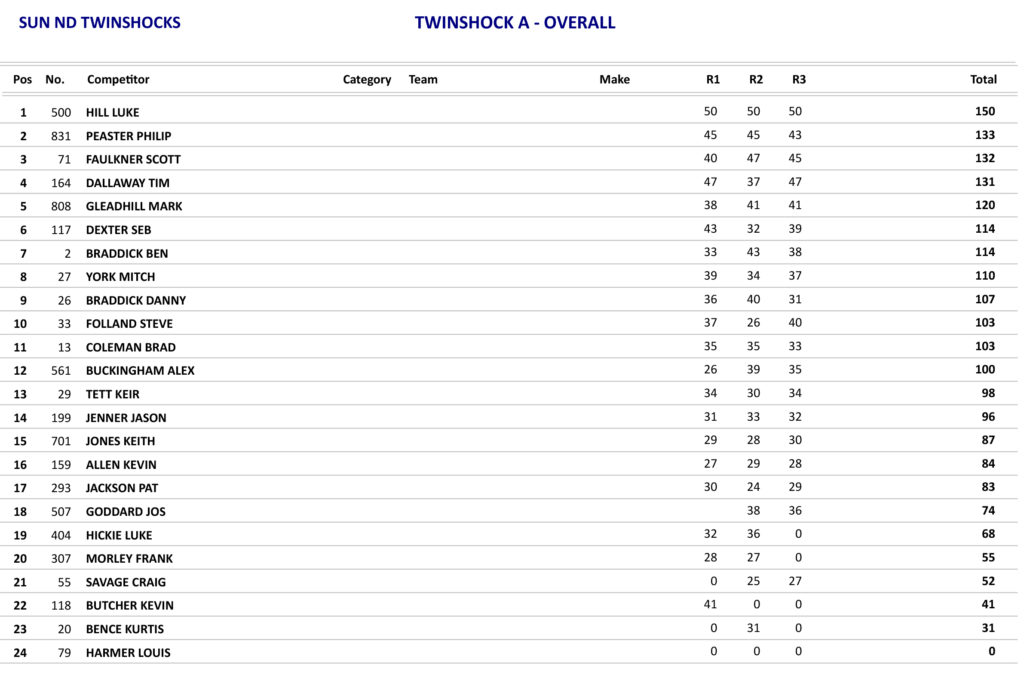 The Twinshock A class on the Sunday was just as it was the day before with Hill dominating the proceedings with another hattrick of wins with Philip Peaster on his 465 Yamaha finishing well in all three races to take second overall from Scott Faulkner by one point.
