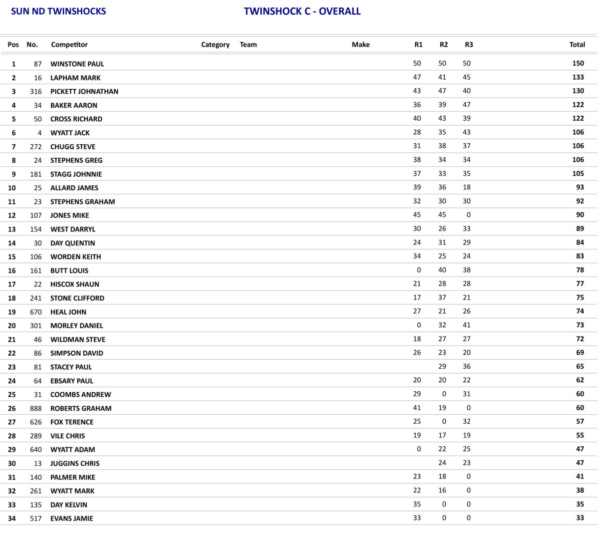 The Twinshock C class saw a fine ride from Paul Winstone on his 250 Honda who was to blitz the rest of the field in all three races.
