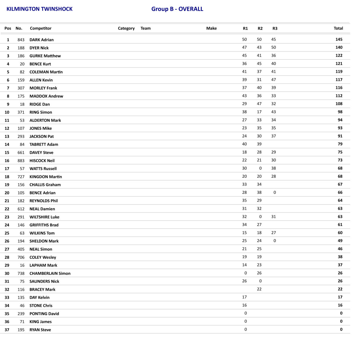 The Twinshock B class saw Ade Dark on his 560 KTM win the opening two races, but he had to settle for third in the last moto as Nick Dyer on his RM 400 Suzuki was to win the last race by some four seconds from Kevin Allen on his 560 KTM but it was Dark who took the overall from Dyer with Matthew Gurke on the 490 Suzuki after three consistent rides taking third overall.