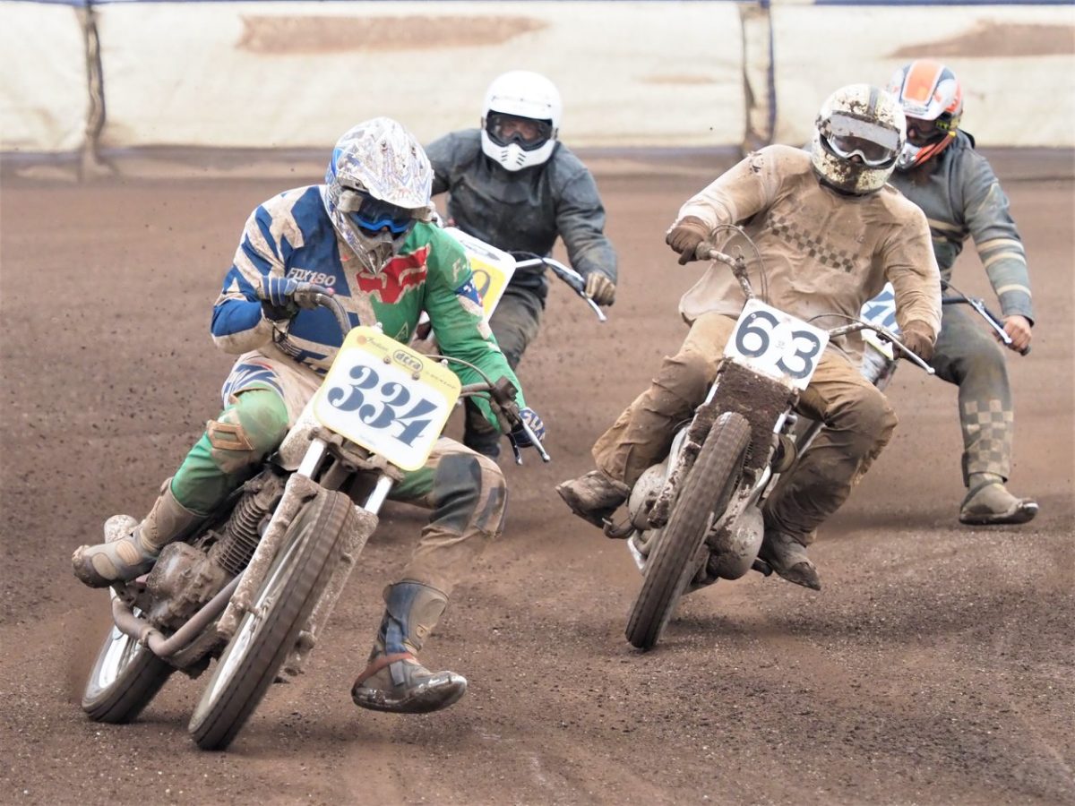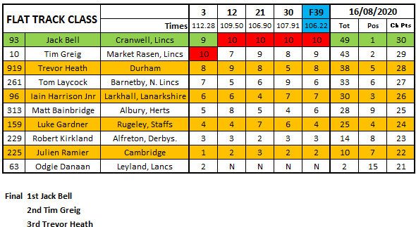 Jack Bell continued his fantastic form in the Flat Track class being defeated only the once by Tim Greig who finished second with Trevor Heath third.