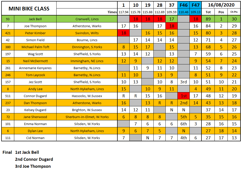 Jack Bell again put in a good shift to take the victory in the Minibike Class but he did on one occasion get beat by Joe Thompson who finished second.