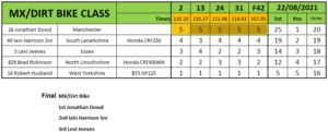 In the MX group Jonathan Dowd was a dominant force winning all of the heats and the final over Iain Harrison Senior and Levi Jeeves.