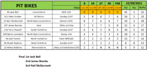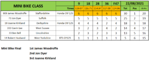Bell did the double once again by going through the card in the Pitbikes with James Bowles second in the final and Neil Mcdermott third.