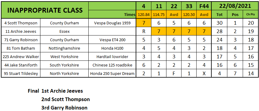 Archie Jeeves came back from a first race retirement to win out in the Inappropriates over race one winner Scott Thompson in second and Garry Robinson third.