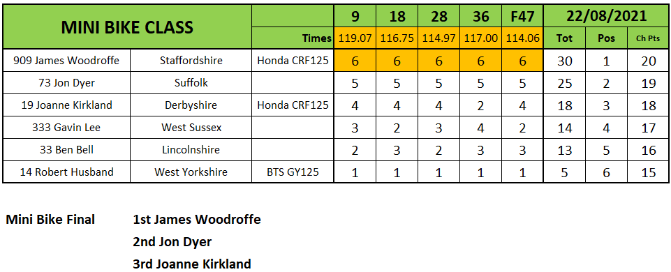 James Woodruffe was commanding in the Minibikes and fended off Jon Dyer and Joanne Kirkland in the final.