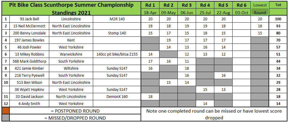 Bell did the double once again by going through the card in the Pitbikes with James Bowles second in the final and Neil Mcdermott third.