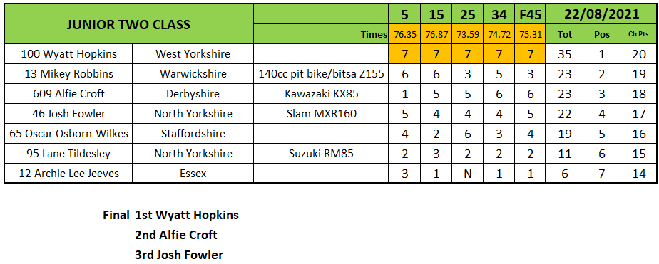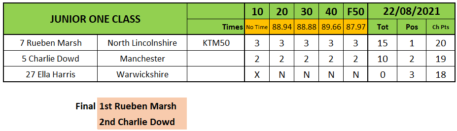 Rueben Marsh was the top dog in Junior one beating second places Charlie Dowd in each race, while in Junior two Wyatt Hopkins had a great day taking the number one spot ahead of Alfie Croft and Josh Fowler.