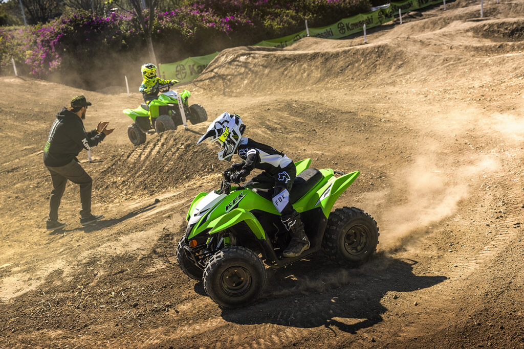 Aggressively styled to echo larger, adult focused KFX quad machines – as well as drawing influence from the two-wheeled KX motocross range – there is no mistaking the updated and restyled frontal area of the lime green racing bodywork with its tall front fenders and Kawasaki branded handlebar pad, but that is just part of the story.